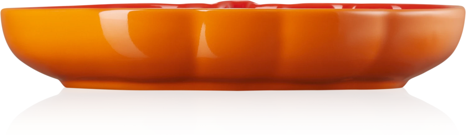 Le Creuset Kürbisteller mittel in ofenrot. Teller in Kürbisform eignet sich sowohl zum Servieren eines mehrgängigen Menüs als auch zum angemessenen Präsentieren von Kleinigkeiten.