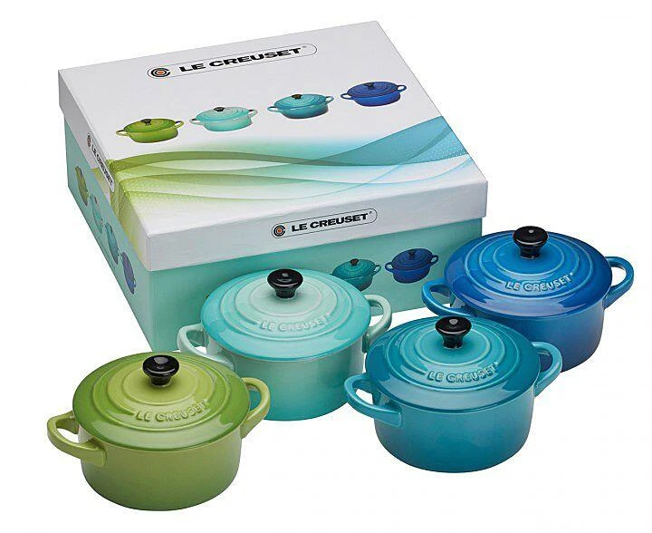 Le Creuset Mini-Cocotten Meeresbrise, 4er-Set mit Deckel. Die Mini-Cocottes sind vielfältig einsetzbar, z.B. als Marmeladentöpfchen, zum Servieren von Snacks oder zum Zubereiten von kleinen Gerichten und Desserts.