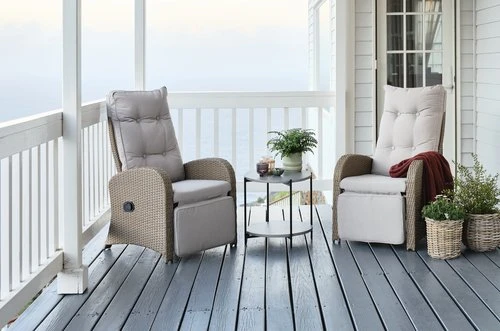 Aluminium und Polyrattan. Rückenlehne und Beinstütze stufenlos verstellbar. Inkl. Premium-Polstern mit strapazierfähigem, strukturgewebtem Bezug. B66 x H102 x T78 cm