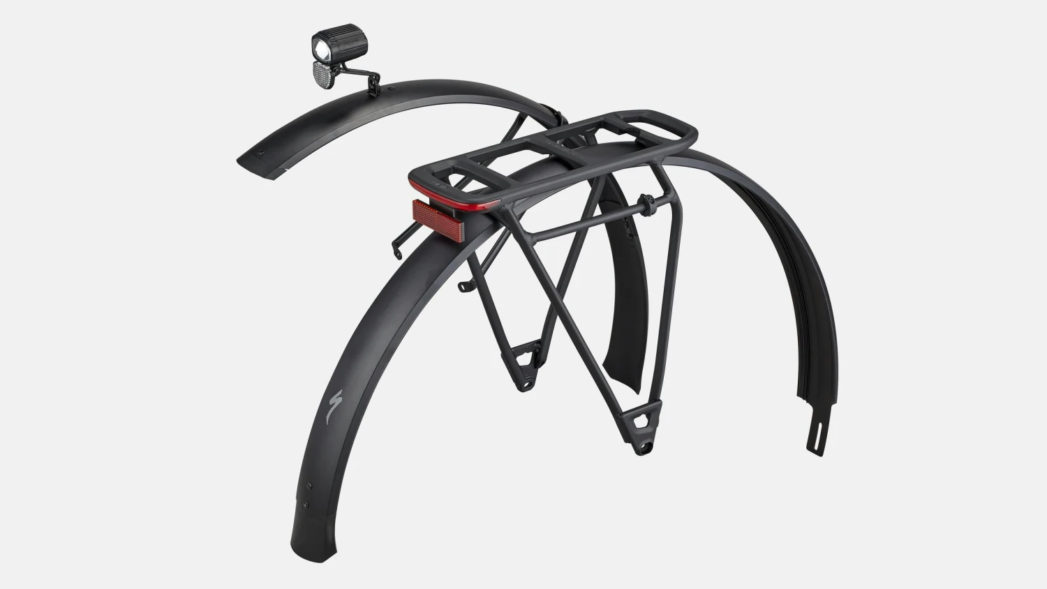 Schutzbleche, Lichter und Gepäckträger für das Turbo Tero• Seitenständer separat erhältlich• Die im Windkanal entwickelten DRYTECH Schutzbleche halten dich und dein Bike sauber und trocken.• Der hintere Gepäckträger ist kompatibel mit herkömmlichen Standard Seitentaschen und MIK-kompatiblem Zubehör.• Kabelgebundene LED Lichter werden mit dem internen Akku betrieben und müssen somit nie geladen werden.• Die maximale Zuladung am Gepäckträger beträgt 27 kg.