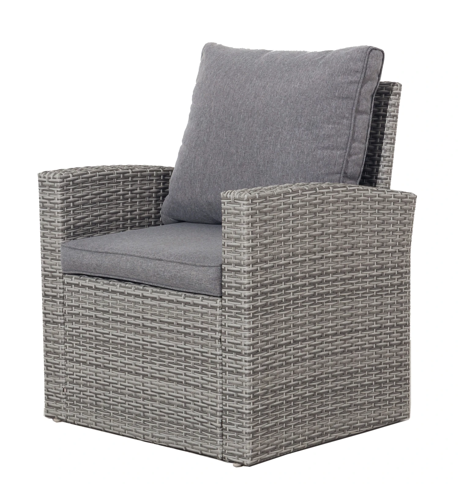 Loungesessel passend zu Dining Lounge Möbelset Grassina. Der Sessel besteht aus einem witterungsbeständigen Kunststoffgeflecht. Die grauen Sitzauflagen sorgen für einen angenehmen Sitzkomfort.