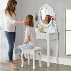 Juskys Schminktisch Julia – Frisiertisch Mit Spiegel, Hocker & 4 Schubladen – Weiß – Mädchen Kinder